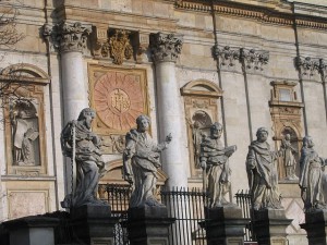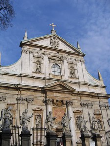 Dokładnie przyjrzeliśmy się także kościołom znajdującym się przy ulicy Grodzkiej. Kościół Świętych Apostołów Piotra i Pawła znajduje się we wschodniej części placu św. Marii Magdaleny, w pobliżu kościoła św. Andrzeja. Jest to prawdopodobnie największy pod względem pojemności kościół zabytkowy w Krakowie. Wikipedia podaje, że jest to pierwsza budowla architektury barokowej w Krakowie. Ufundowana została dla jezuitów przez króla Zygmunta III Wazę. Plan kościoła wykonał prawdopodobnie Giovanni de Rossis, plan ten był realizowany od 1597 roku – najpierw przez Józefa Britiusa, a następnie modyfikowany przez Giovanniego Marię Bernardoniego. Ostateczny kształt kościołowi nadał w latach 1605-1619 Giovanni Trevano i to on jest autorem fasady, kopuły i wystroju wnętrza. Kościół ma szeroki, jednonawowy korpus z nawami bocznymi o charakterze kaplic, transept z kopułą na skrzyżowaniu oraz prostokątne (krótkie) prezbiterium zamknięte półkolistą apsydą. Dwukondygnacyjna fasada z dolomitu przypomina rzymski kościół Santa Susana Carla Maderny, ale są w niej też echa fasady głównego kościoła jezuickiego Il Gesù w Rzymie. W niszach znajdują się posągi świętych jezuickich: św. Ignacego Loyoli, św. Franciszka Ksawerego, św. Alojzego Gonzagi oraz św. Stanisława Kostki dłuta Dawida Heela, a nad portalem głównym godło zakonu jezuitów; w górnej kondygnacji św. Zygmunt i św. Władysław. Ogrodzenie placu z rzeźbami apostołów zostało zaprojektowane przez Kacpra Bażankę, a wykonane w roku 1722 przez Dawida Heela z wapienia pińczowskiego. Dziś, na miejscu XVIII-wiecznych, bardzo zniszczonych oryginałów, znajdują się współczesne kopie (także z wapienia pińczowskiego), wykonane przez Kazimierza Jęczmyka. Przyczyną tego stanu są kwaśne deszcze wymywające twarze rzeźb. |