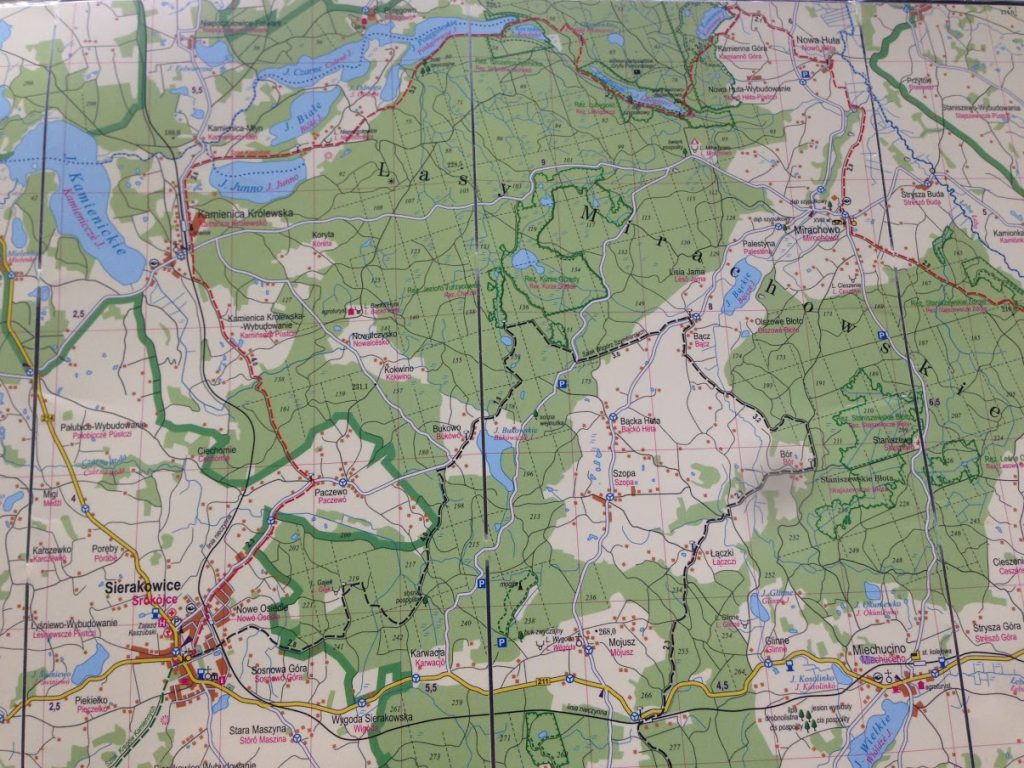 Do Sierakowic dojechaliśmy bez komplikacji, wysiedliśmy w centrum i od razu ruszyliśmy na szlak. Pierwszą część asfaltem przeszliśmy dość szybko, by w końcu znaleść się w Paczewie, skąd skęciliśmy na północ i teraz już lasem a następnie szutrową drogą szliśmy w kierunku Kamienicy Królewskiej. Za Kamienicą szlak odbija ostro na wschód, wzdłóż północnych brzegów Jeziora Jumno.
